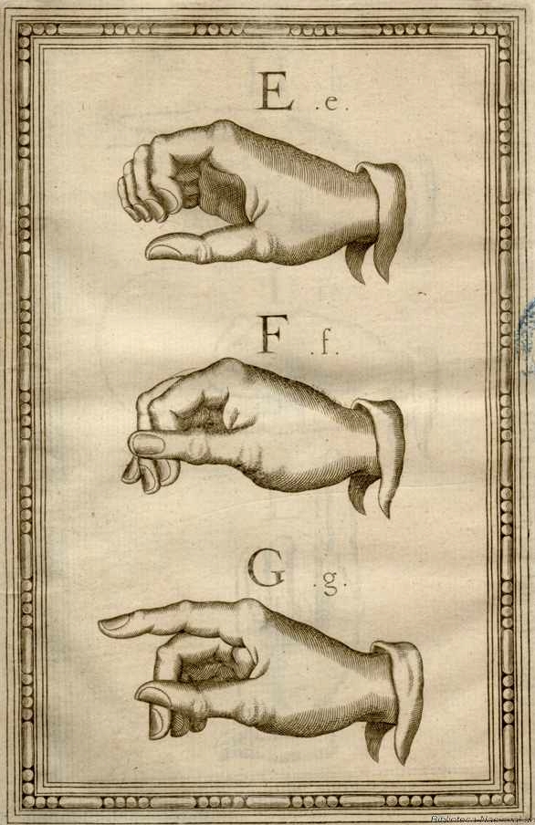 This pronouncement would, unfortunately, reverberate through the ages and it was not until the 17th century that manual alphabets began to emerge, as did various treatises on deaf education, such as Reducción de las letras y arte para enseñar a hablar a los mudos (‘Reduction of letters and art for teaching mute people to speak’), written by Juan Pablo Bonet in Madrid in 1620, and Didascalocophus, or, The deaf and dumb mans tutor, written by George Dalgarno in 1680.