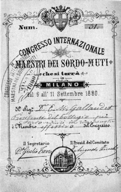 In 1880, The Second International Congress on Education of the Deaf was held in Milan. After five days of deliberations, the conference declared that oral education (the use of lip reading and speech) was superior to manual education (the use of sign language) and passed a resolution banning the use of sign language in schools. This leads to the widespread suppression of sign language in many Deaf schools throughout the world.